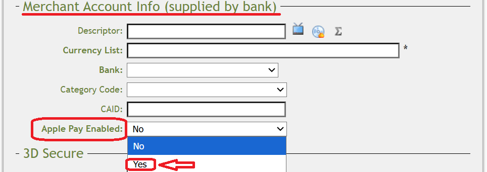 After PayXpert has confirmed that the account has been configured for Apple Pay, the RocketGate Merchant Account "Apple Pay Enabled" setting for PayXpert must be set to "Yes".